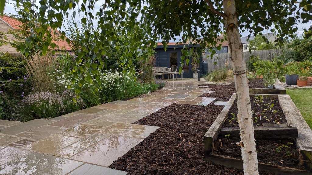 We designed and installed this mixed size sandstone paving to create a meandering pathway leading through to a garden studio. We call it hit ‘n’ miss style. Our garden maintenance team will be planting up the extended borders throughout the year to really bring this design to life
